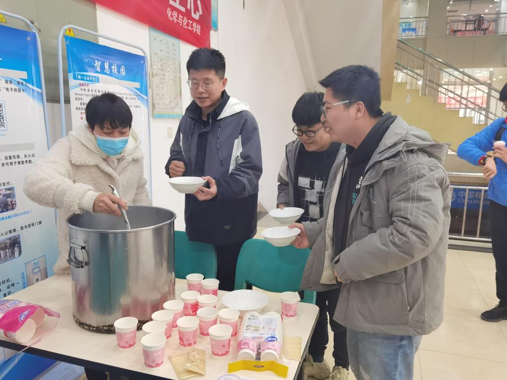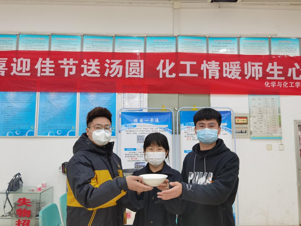 在元宵节来临之际,为欢迎刚刚返校的广大同学,共同度过一个美好的节日,2月25日,我院系各领导老师走访学生宿舍,仔细查看宿舍情况,与大家进行亲切的交流,认真询问了大家假期生活情况、新学期的计划等,并强调各宿舍要保持清洁卫生,团结互助,树立优良舍风学风。2月26日下午5点-6点,化工院联合学校食堂在禾顺园门口开展了免费送汤圆活动。看到老师们准备的特殊礼物、听到暖心慰问的话语,同学们都感到非常地欣喜和感动,并对领导老师的关心表示感谢,表达了对学校的美好祝愿。