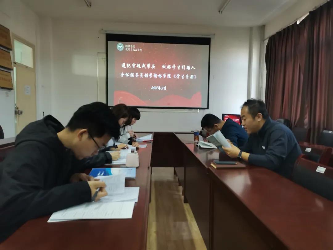 在本次学习中,每位老师分章节对《15vip太阳成学生手册》进行讲解,使大家进一步加深了对《15vip太阳成学生手册》内容的理解,明晰了学校学生管理各项规章制度,在今后的学生管理的过程能够有据可依、有章可循,严格按照《15vip太阳成学生手册》的要求做好学生管理工作,助力我院“追赶超越”工作任务顺利完成。