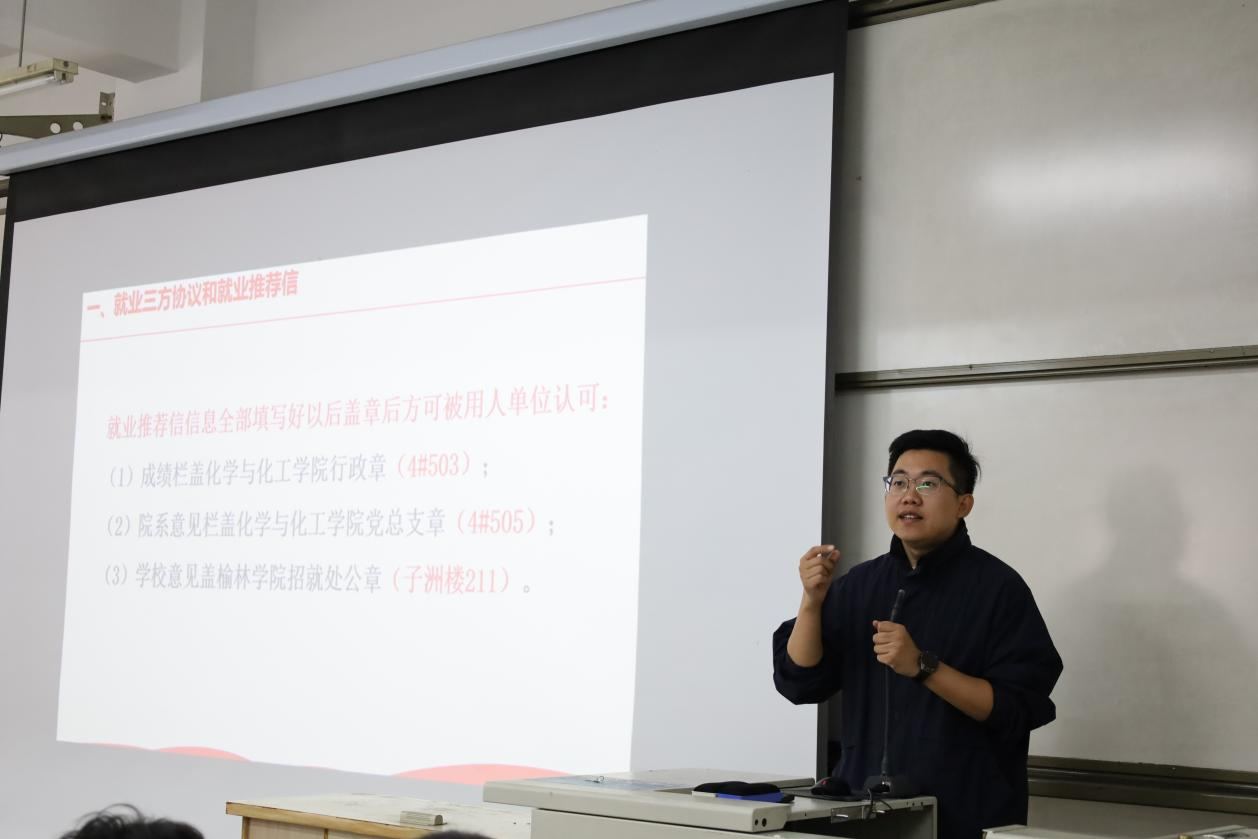 在就业动员环节,陈小辉书记立足化工行业发展实际与学院往届就业数据,为学子们送上针对性就业指引。一要紧抓秋招“黄金期”,秋招是化工企业招揽核心人才的主要阶段,岗位质量与数量优势突出,同学们要破除“考研考公无需参与秋招”等误区,通过秋招锁定保底机会;二要拓宽就业视野,打破“唯国企论”“唯城市论”,介绍优质民营化工企业在技术创新、人才晋升优势及成长机遇,鼓励学子到一线岗位积累项目经验,在实践中提升专业竞争力;三要校准就业观念,希望同学们树立正确职业观、就业观与择业观,客观评估自身专业能力与行业需求,既不盲目追求“高薪热门岗”,也不轻视基础岗位价值,始终保持对化工行业的职业信念,以踏实态度开启职业生涯。